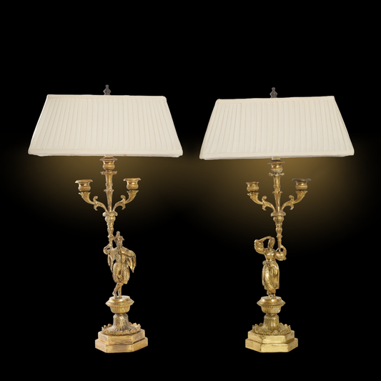 Antique French Empire Gilt and Patinated Bronze Candelabra Table Lamps, Pair of